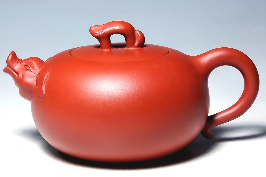 作品的壺嘴以寫意的手法,勾勒出豬的豐足意象,真的很有作品特色...,壺鈕以豬的古老象形圖騰,化為雕塑的立體形象,充滿動感的立於蓋面之上,飽滿圓潤而略矮的身筒,配上富張力的順溜的壺把,壺把末端十分巧妙的勾起來,像極了可愛的豬尾巴的形象!