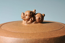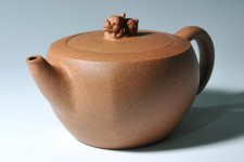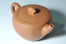 【韓洪波手製‧御龍壺f】,作品以豐裕飽滿的可愛龍型小雕塑為鈕(辟邪),蓋面直舖至壺肩轉折過渡處,皆以豐滿的曲面構成,辟邪龍鈕居中,益顯搶眼與生動!