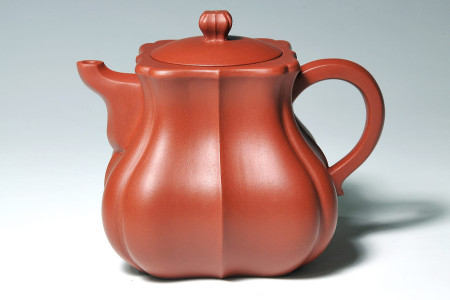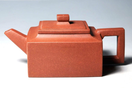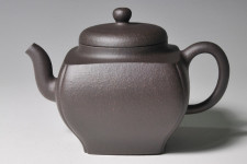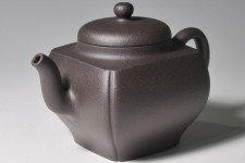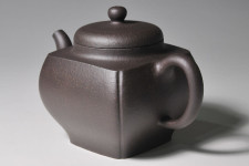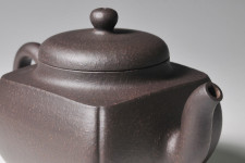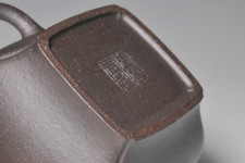 四方抽角身筒飽滿又不失緊結,壺肩飽滿上寬線條過渡蜿蜒漸收攏至壺底微翻為止,壺肩呈一平面,襯托起如光貨般的弧圓壺蓋,蓋面中央暗線處理出一顆圓珠成壺鈕,配上滾圓而充滿張力的三彎流壺嘴,及相互呼應的外圓內平弧圓壺把,既能確保提壺時的工學與穩定性,又能兼顧造型的勻稱和美感,更特別的是,周偉君老師在壺底片上,鉅細靡遺、不厭其煩的仍在四方抽角的四個角落,延伸出由身筒直至壺底片子的「抽角」線條,十分別緻而讓人一見難忘,真是集設計巧思與綿密精緻製壺功力的絕妙作品呀!
