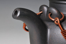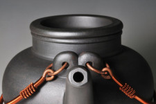 《晚青蟻跡朱泥》成品的胎表如螞蟻尋蹤過的蟻跡(如蟻足踏過的凹陷痕跡),此乃原礦中含有紅色珍稀之高縮比朱泥礦,故經高溫燒成後,始呈現十分特殊的小凹點收縮痕,胎表微細小凹點密佈不可計數,真是美不勝收,讓人直嘆大自然之奇妙珍稀!
